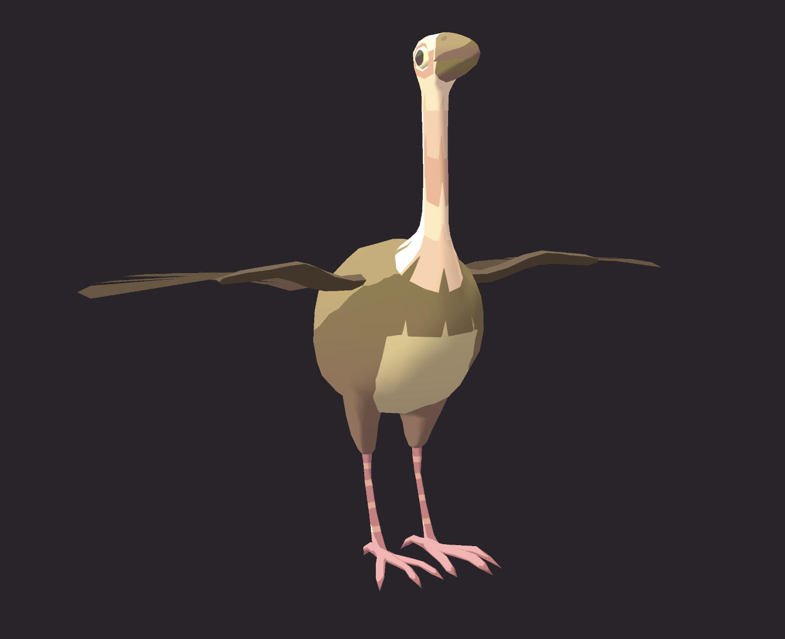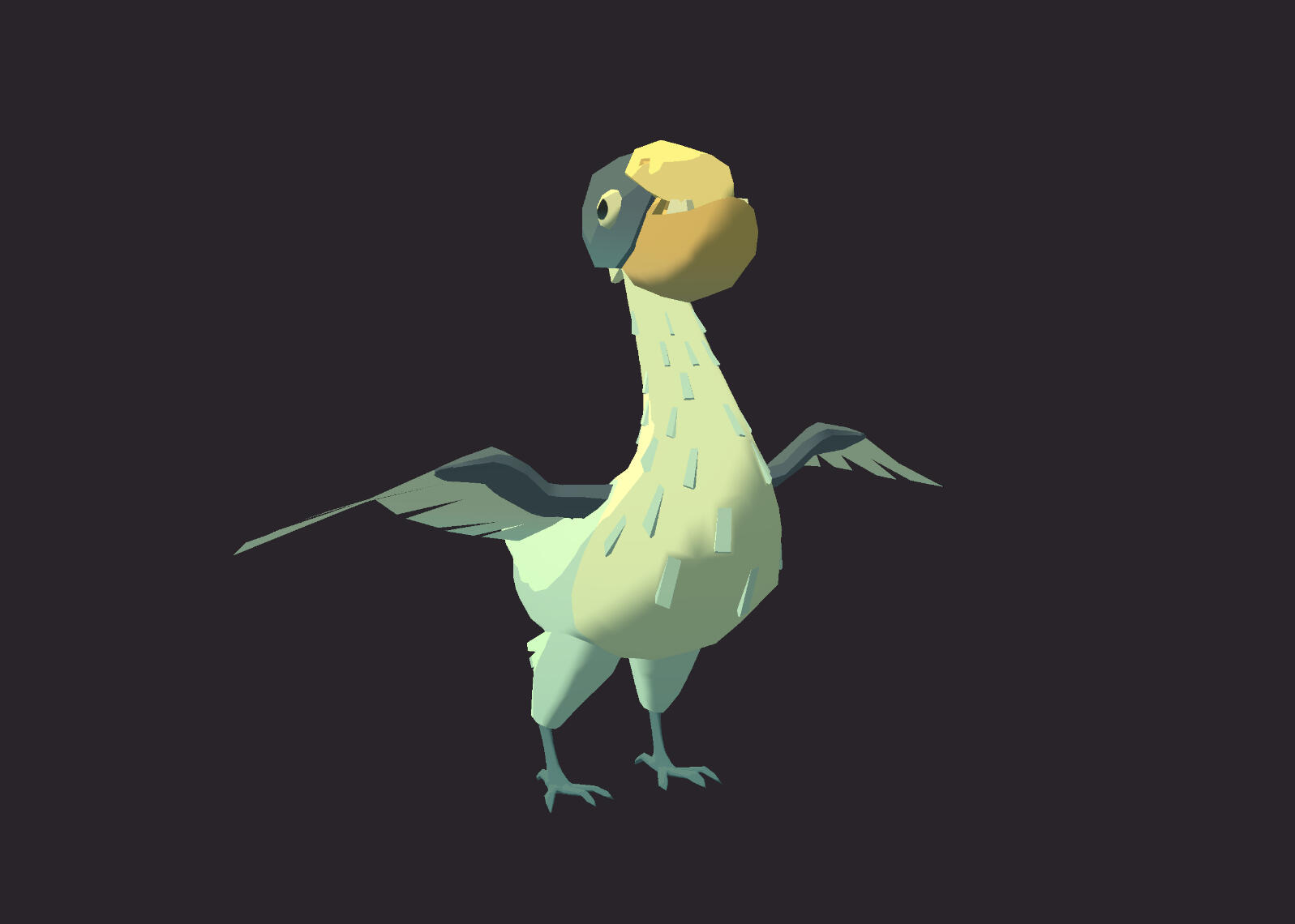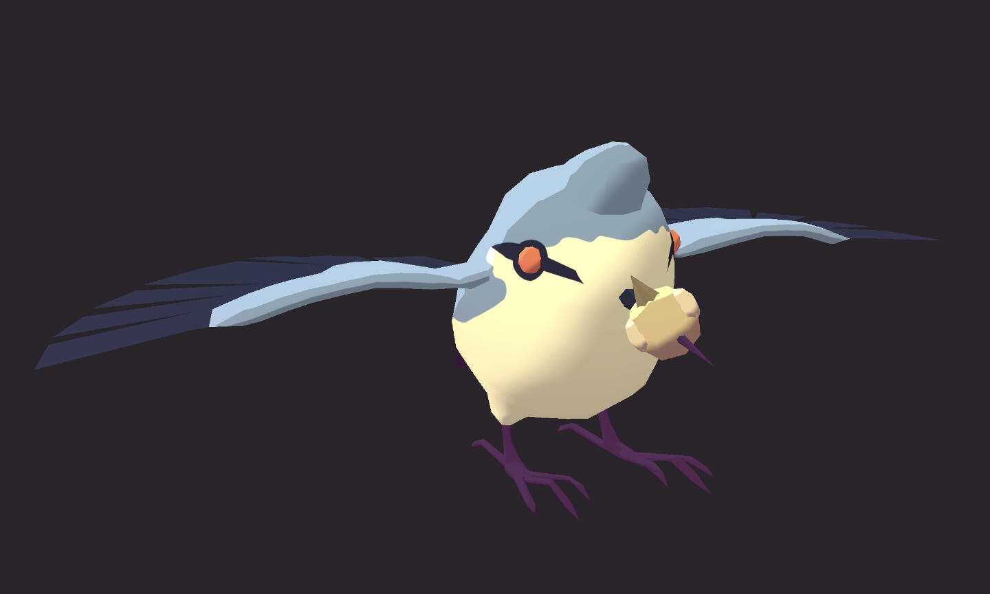 Rigging, and retargeting the rigs, was the largest struggle I faced. I used a Maya plugin, Advanced Skeleton, at first, since they have a bird rig, but found that their rig for wings didn't achieve what I wanted to- there were too few bones to fold the wing nicely. I ended up just making my own rig, which gave me more control of how I wanted the wings to fold.There are still relatively few bones compared to more advanced skeletons, however I managed to achieve what I needed it to. Additionally, another issue I faced was the anatomy of bird wings, and how they fold into each other in nature. How realistic meshes replicate birds is often by making every individual feather a mesh, and bending them properly along a curve. However, Birdteeth's visual design was quite simple, and with the amount of separate models needed, it was more efficient to opt for a model that was less complex for retargeting to future models. In Birdteeth, the wings are all one plane, and the folding is not anatomically correct, however it is done quick enough and on a simple enough model to effectively trick the player.