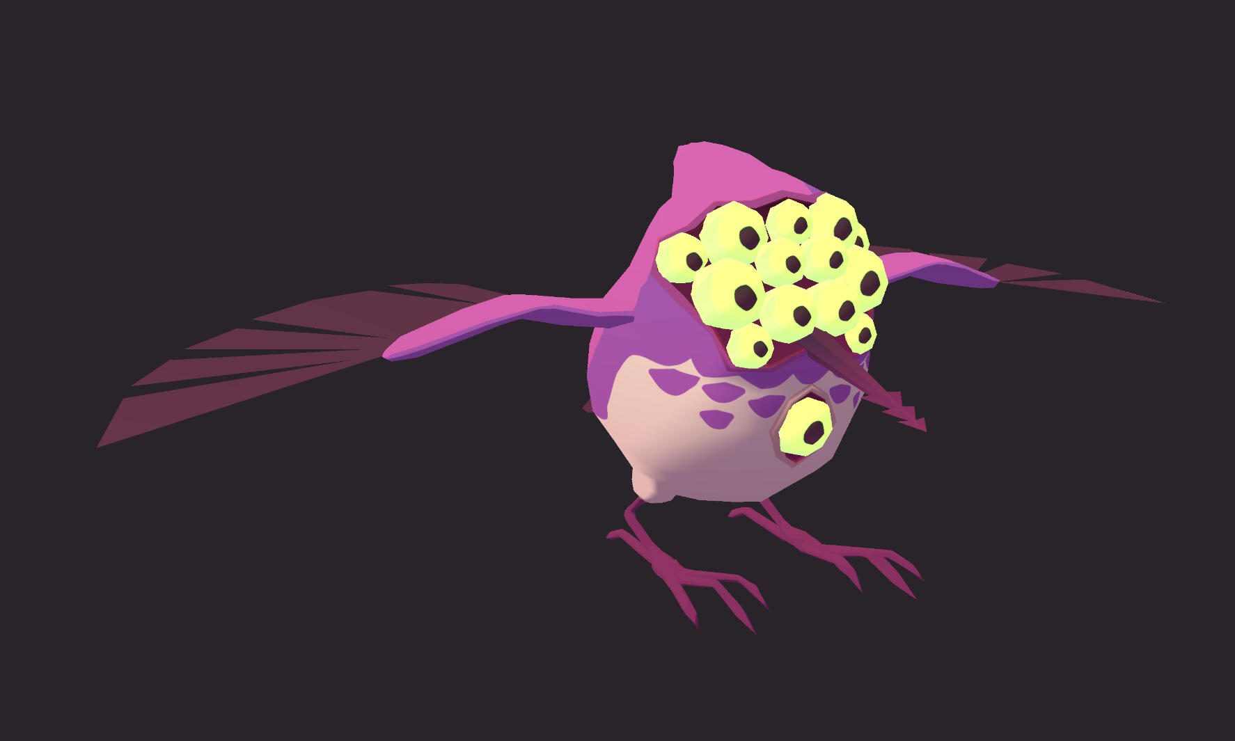 The only character that has a more diverse color pallette is the player, with its bright turquoise eyes contrasting to the pink and purple, allowing the player to stand out amongst the crowd. Still, I wanted the player’s colors to remain simple, to prevent messiness that could occur if one area has too many colors compared to the rest of the environment. To still achieve the main focus on the character, there is only one point of contrast on the eyes, allowing it to pop out.